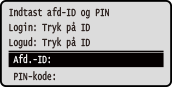 Hvis administrering af afdelings-id er indstillet, vises følgende login-skærm. Indtast afdelings-id'et for at logge på. Hvis der er indstillet en PIN-kode, skal du indtaste PIN-koden.