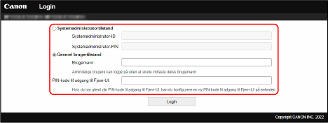 Hvis der logges på med systemadministratortilstand, skal du indtaste systemadministratorens id og PIN-kode.
