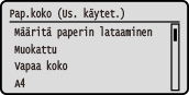 Jos paperia lisätään monikäyttötasolle, seuraava näyttö tulee esiin käyttöpaneelissa. Aseta paperin koko ja tyyppi lisätyn paperin mukaisesti.