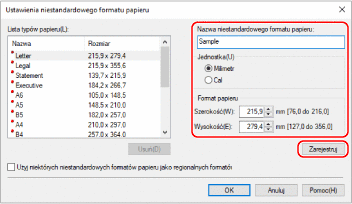 Wprowadź nazwę papieru o niestandardowym rozmiarze i rozmiar papieru, a następnie kliknij [Zarejestruj].