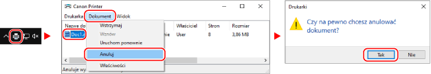 Jeśli powyższy ekran nie zostanie wyświetlony, kliknij dwukrotnie ikonę drukarki w obszarze powiadomień systemu Windows, wybierz dokument do anulowania i kliknij na [Dokument]