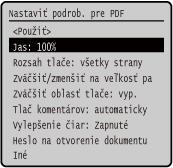 Ak chcete zobraziť túto obrazovku, na obrazovke s nastaveniami tlače z pamäťového média stlačte tlačidlo [Nastaviť podrob. pre PDF].