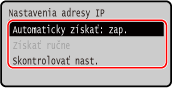 Za bežných okolností ju nastavte na [DHCP]. Ak je však [DHCP] nastavené v prostredí, v ktorom nie je možné použiť DHCP, zariadenie bude v sieti neustále potvrdzovať možnosť Automaticky získať, čím vznikne zbytočná komunikácia. Ak DHCP nepoužívate, nastavte tento parameter na [Vyp.].