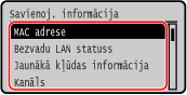 Līdz ar MAC adresi un bezvadu LAN savienojuma informāciju, kad iekārta ir pievienota bezvadu LAN, varat skatīt arī drošības iestatījumus.