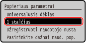 Jei dažnai reikia keisti įdedamo popieriaus formatą, nustatykite [Universalus]; taip sumažinsite kaskart keičiant parametrą atliekamų veiksmų skaičių. Tačiau atminkite, kad pagal šį parametrą aparatas spausdins, net jei spausdintuvo tvarkyklėje nustatytas popieriaus tipo parametras nesutampa su popieriaus, faktiškai įdėto į aparatą, tipu.