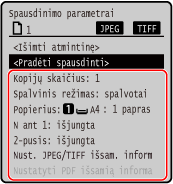 Rodomas atminties laikmenos spausdinimo parametrų ekranas.