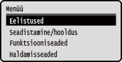 Ekraanikuva muutmineJuhtpaneeli ekraanikuva saate muuta, näiteks muuta kuvamiskeelt ja ühikuid ning teateid kuvada ja peita. [Ekraaniseaded] Te saate kuva värvusi pöörata ja muuta heledust, et ekraani oleks mugavam vaadata. [Hõlbustus] Sätete automaatne tühistamineKui teatava aja möödudes ei ole mingeid toiminguid tehtud, kustutatakse vaikimisi ekraanilt määratavad sätted ja ilmub kuva [Avamenüü]. Te saate muuta sätete kustutamiseni jäetud aega ja seejärel ilmuvat kuva. [Automaatne lähtestusaeg] [Funkt. pärast autom. lähtest.] |
