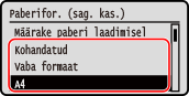 Kui paber on mitmeotstarbelisse salve laaditud, kuvatakse juhtpaneelil paberiformaadi ja -tüübi seadistamise kuva.