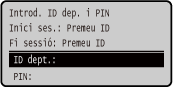 Si la Gestió de l'ID de departament està configurada, apareixerà la següent pantalla d'inici de sessió. Introduïu l'ID de departament per iniciar la sessió. Si hi ha un PIN definit, introduïu-lo.