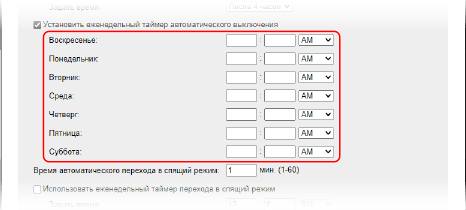 Введите время для каждого дня недели, в течение которого аппарат должен быть выключен.