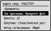 Для того чтобы открыть этот экран, нажмите [Задать сведения JPEG/TIFF] на экране настроек печати с запоминающего устройства.