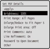 להצגת המסך, לחץ על [Set PDF Details] ב-Memory Media Print הגדרות מסך.