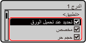 لا تُعرض أحجام الورق التي تم مسح مربعات الاختيار الخاصة بها على شاشة إعدادات الورق.