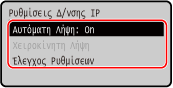 Κανονικά, ορίζεται το [DHCP]. Ωστόσο, όταν το [DHCP] οριστεί σε περιβάλλον στο οποίο δεν μπορεί να χρησιμοποιηθεί, η συσκευή θα συνεχίσει να επιβεβαιώνει την Αυτόματη Λήψη στο δίκτυο, δημιουργώντας περιττή επικοινωνία. Όταν δεν χρησιμοποιείτε DHCP, ορίστε το σε [Off].