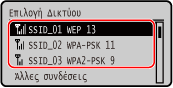 Για να καθορίσετε διαφορετική μέθοδο ελέγχου ταυτότητας ή κρυπτογράφησης, χρησιμοποιήστε τη μέθοδο μη αυτόματης ρύθμισης για τη σύνδεση. Σύνδεση σε ασύρματο LAN με ρύθμιση λεπτομερειών (μέθοδος μη αυτόματης ρύθμισης)