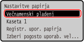 Ko v večnamenski pladenj vložite papir, je na nadzorni plošči privzeto prikazan zaslon za nastavitev velikosti in vrste papirja.