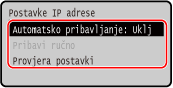 Obično se postavlja na [DHCP]. Međutim, ako je mogućnost [DHCP] postavljena u okruženju u kojem nije moguće upotrebljavati DHCP, uređaj će i dalje potvrđivati postavku automatskog pribavljanja unutar mreže, što će dovesti do nepotrebne komunikacije. Dok se DHCP ne upotrebljava, namjestite tu postavku na [Isključeno].