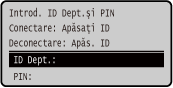 Când gestionarea ID-ului de departament este configurată, se afișează următorul ecran de conectare. Introduceți ID-ul de departament pentru a vă conecta. Dacă este setat un cod PIN, introduceți-l.