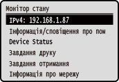 Використовуйте цей екран, щоб переглянути інформацію про апарат, його використання та журнали, параметри мережі й відомості про помилки. За допомогою цього екрана можна також виймати USB-накопичувачі з апарата.