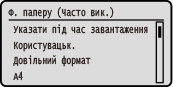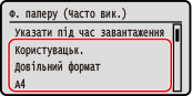 Якщо потрібно часто змінювати папір для завантаження, установіть параметр [Довільний]. Це зменшить кількість кроків, які необхідно щоразу виконувати для зміни параметрів. Проте слід пам’ятати, що в такому разі апарат друкуватиме, навіть якщо завантажений папір відрізняється від типу паперу, указаного в драйвері принтера.