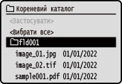 Виберіть [Вибрати файли та друкувати] і натисніть . Екран вибору файлів на USB-накопичувачі