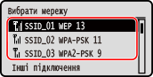 Знайдіть маршрутизатор безпроводової локальної мережі (точку доступу), до якого слід підключитися, і введіть ключ мережі. У разі підключення методом налаштування точки доступу встановлюються такі методи автентифікації та шифрування: метод автентифікації WEP: Open System; шифрування для WPA/WPA2: автоматично встановлюється протокол AES-CCMP або TKIP з урахуванням вибраного маршрутизатора безпроводової локальної мережі. Щоб указати інший метод автентифікації чи шифрування, підключіться за допомогою методу налаштування вручну. Підключення до безпроводової локальної мережі за допомогою налаштування даних (метод налаштування вручну) |
