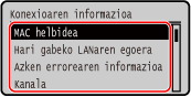 MAC helbidea eta hari gabeko LANari buruzko konexio-informazioaz aparte, makina hari gabeko LANera konektatuta dagoenean, segurtasun ezarpenak ere ikus ditzakezu.