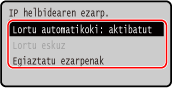 Normalean, ezarri [Aktibatuta] gisa. DHCPrekin gordetako IP helbideak lehentasuna izan arren, DHCPk erantzuten ez badu, Auto IP erabiliko da.