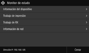 Utilice esta pantalla para comprobar la información del equipo, el uso y los registros, las opciones de red y la información de error. También puede usarla para extraer dispositivos de memoria USB del equipo.