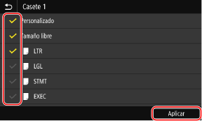 Los tamaños de papel cuyas casillas estén desmarcadas no aparecen en la pantalla de configuración del papel.
