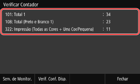 Operações disponíveis na tela de Verificação do ContadorPressione [Serv. de Monitor.] para verificar a conexão com o servidor de monitoramento. Execute esta operação para enviar as informações da máquina regularmente ao servidor de monitoramento. Pressione [Verif. Conf. Disp.] para verificar a configuração de opções na máquina.