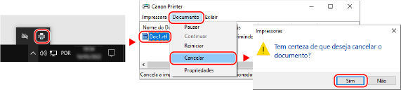 Se a tela acima não for exibida, clique duas vezes no ícone da impressora na área de notificação do Windows, selecione o documento a ser cancelado e clique em [Documento]
