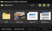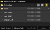 Insira o dispositivo de memória USB na máquina e na tela [Início], pressione [Impressão de Mídia Memória] para exibir os arquivos e pastas no dispositivo de memória USB.
