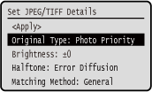 To display the screen, press [Set JPEG/TIFF Details] on the Memory Media Print settings screen.