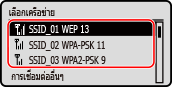 ค้นหาเราเตอร์ LAN แบบไร้สาย (จุดเข้าใช้งาน) ที่จะเชื่อมต่อ และใส่คีย์เครือข่าย เมื่อคุณเชื่อมต่อด้วยวิธีการตั้งค่าจุดเข้าใช้งาน วิธีการตั้งค่าการรับรองความถูกต้องและการเข้ารหัสจะถูกตั้งค่าดังนี้: วิธีการรับรองความถูกต้อง WEP: ระบบเปิด การเข้ารหัสสำหรับ WPA/WPA2: AES-CCMP หรือ TKIP ถูกตั้งค่าโดยอัตโนมัติตามเราเตอร์ LAN แบบไร้สายที่เลือกไว้ หากต้องการระบุวิธีการรับรองความถูกต้องหรือวิธีการเข้ารหัสอื่น ให้ใช้วิธีการตั้งค่าด้วยตนเองเพื่อเชื่อมต่อ การเชื่อมต่อกับ LAN แบบไร้สายโดยการตั้งค่ารายละเอียด (วิธีการตั้งค่าด้วยตนเอง) |
