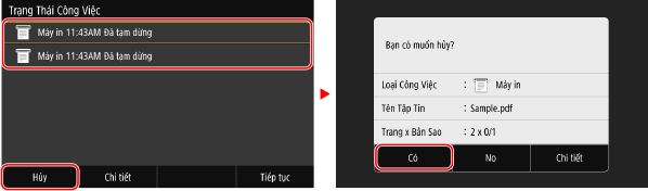 Nếu màn hình danh sách công việc được hiển thị, chọn công việc cần hủy và nhấn [Hủy]