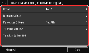 Untuk model panel sentuhan, anda juga boleh menetapkan semula tetapan kepada tetapan yang ditetapkan di sini dengan menekan [Set Semula] pada skrin tetapan cetakan.
