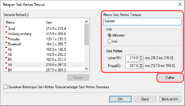 Mendaftarkan Kertas Saiz Bukan Standard pada Komputer (Saiz Tersuai)