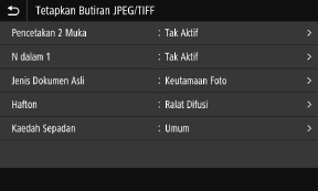 Untuk memaparkan skrin, tekan [TtpknButiranJPEG/TIFF] pada skrin tetapan Cetakan Media Memori.