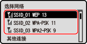 搜索要连接的无线局域网路由器(接入点),然后输入网络密钥。 使用接入点设置方法连接时,将设置以下验证和加密方法: WEP 验证方法:开放系统 将根据选择的无线局域网路由器自动设置 WPA/WPA2 加密:AES-CCMP 或 TKIP。 若要使用不同的验证或加密方法,请使用手动设置方法进行连接。通过设置详细信息连接无线局域网(手动设置方法) |