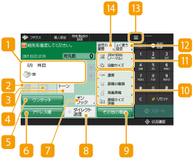 組み合わせによっては同時に設定できない機能があります。設定できないボタンは薄いグレーで表示されます。 画面右上に、指定した宛先の総数が表示されます。 |