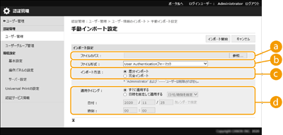 User Authenticationで使用できるファイル形式で作成されたユーザー情報をインポートします。ファイルの拡張子は、「csv」です。