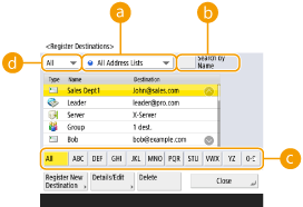 If you want to register many destinations or classify them by department or business partner, register them in the Address Book. The Address Book allows you to search destinations by the first character of the name or by selecting a destination type such as fax or e-mail. You can register destinations for all users, destinations for your own use, and destinations that only an administrator can edit. Registering Destinations in the Address Book