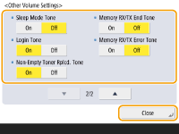 <Sleep Mode Tone> | Sound produced when the machine enters sleep mode, or when the machine is turned OFF if you set <Quick Startup Settings for Main Power> to <On>. (Depending on the situations, the machine does not startup quickly and the tone does not sound.) |