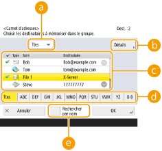 2 | Sélectionnez les destinataires à enregistrer dans un groupe et appuyez sur <OK>. ![]() Liste déroulante des types de destinataireSélectionnez (e-mail), (fax), (I-fax) ou (fichier) pour filtrer les destinataires affichés dans la liste d’adresses ( ). Appuyez sur <Toutes> pour afficher tous les destinataires enregistrés. <Détails/Modification>Sélectionnez un destinataire et appuyez sur <Détails/Modification> si vous voulez vérifier les réglages pour le destinataire. Appuyez sur <OK> pour retourner à l'écran précédent. Liste des destinatairesLes destinataires enregistrés dans la liste d'adresses sélectionnée à l'étape 6 s'affichent. Dans cette liste, sélectionnez les destinataires à enregistrer dans un groupe. ![]() Si les destinataires sont gérés par numéros d'accès, ils ne sont pas affichés dans la liste sauf si vous avez saisi un numéro d'accès dans (Restriction de l'accès aux destinataires enregistrés dans le carnet d'adresses) après avoir appuyé sur <Numéro d'accès>. Bouton Première lettreSélectionnez le bouton alphanumérique pour le premier caractère du nom du destinataire. Appuyez sur <Toutes> pour afficher tous les destinataires enregistrés. <Rechercher par nom>Saisissez le nom du destinataire. Appuyez à nouveau sur <Rechercher par nom> pour retourner à l'écran précédent. |