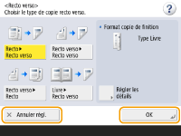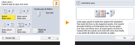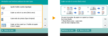 Affichage du guide des fonctionsAppuyez sur <Didacticiel> pour afficher un écran vous présentant les fonctions de l'appareil et vous donnant des conseils au sujet de la copie ou encore de la numérisation. Consultez cet écran si vous souhaitez en savoir plus sur la disponibilité et l'utilisation des fonctions. ![]() Exemple : didacticiel des fonctions de copie Si vous sélectionnez un élément de la liste, l'écran du didacticiel s'affiche. ![]() Utilisation de la fonction d’aideSelon la fonction affichée, apparaît dans la partie supérieure droite de l’écran. Appuyez sur pour consulter la description et le mode d’emploi de la fonction.![]() Appuyez sur <Fin de communication> pour revenir à l'écran précédent. Fonctionnement similaire à celui d’un smartphone (balayage, glisser-déposer)Dans certains écrans, vous pouvez passer d'une page à une autre ou faire défiler l'écran en effectuant un mouvement de balayage avec votre doigt, vers le haut, le bas, la gauche ou la droite, comme vous le feriez avec un smartphone. ![]() ![]() Vous pouvez également désactiver l'option permettant de faire défiler le contenu ou avec un doigt. <Utiliser la fonction Glisser> Vous ne pouvez pas utiliser les commandes par balayage de l'écran et glisser-déposer si l'option <Inverser couleurs écran> est réglée sur <Oui>. <Inverser couleurs écran> Dans les écrans qui comportent des touches mobiles, les touches peuvent être déplacées par glisser-déposer. ![]() |