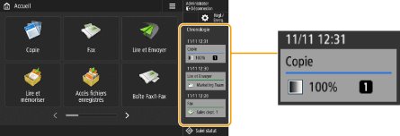 Les 10 derniers éléments de l'historique sont conservés dans l'ordre chronologique sur la ligne de temps. L'historique des tâches antérieures est supprimé de la ligne de temps. En cas de réutilisation de l'avant-dernière tâche, l'ordre des deux tâches du haut est inversé, mais le nombre de tâches sur la ligne de temps ne change pas. Toutefois, si les réglages sont modifiés après leur rappel, ils sont traités comme de nouveaux réglages. ![]() Pour supprimer l'historique qui a été automatiquement ajouté ou mémoriser les réglages de cet historique dans l'écran <Accueil> sous la forme d'un bouton personnel/bouton partagé, appuyez de manière prolongée sur l'historique. <Afficher écran de confirmation lors du rappel> et <Commencer opération de rappel (l'opération démarre si l'on appuie sur un bouton)> ne peuvent toutefois pas être sélectionnés lors de la mémorisation d'un bouton personnel/bouton partagé à partir de la ligne de temps. Enregistrement de boutons personnels/boutons partagés Lorsque <Limiter nouvel envoi depuis journal> est défini sur <Oui>, l'historique de « Fax » et « Lire et Envoyer » n'est pas conservé dans la ligne de temps. Les mots de passe suivants peuvent être inclus dans la ligne de temps de chaque utilisateur connecté. Mots de passe de connexion vers des serveurs de fichiers de destination pour la fonction Lire et Envoyer Mots de passe de cryptage pour la fonction Lire et mémoriser (<Mot de passe requis pour ouvrir un doc.> et <M.passe nécessaire pour modif. autoris.>) Pour choisir d'inclure ou non le mot de passe dans la ligne de temps de l'utilisateur connecté, configurez l'option <Interdire mise en cache mot de passe authentification>. Cependant, le mot de passe défini dans <Mot de passe> pour la fonction de fax est conservé dans la ligne de temps, elle que soit la configuration du paramètre <Interdire mise en cache mot de passe authentification>. Le mot de passe n'est pas conservé dans la ligne de temps pour les utilisateurs non authentifiés et les invités, quelle que soit la configuration du paramètre <Interdire mise en cache mot de passe authentification>. Cependant, si le mot de passe défini dans <Mot de passe> pour la fonction de fax a été spécifié, il n'apparaît pas dans la ligne de temps. Si le paramètre <Gérer n° d'accès au carnet d'adresses> est défini sur <Oui>, le journal des tâches d'envoi (« Fax » et « Lire et Envoyer ») pour les utilisateurs non authentifiés et les invités ne s'affiche pas dans la ligne de temps. L'historique des réglages d'un utilisateur connecté peut être partagé avec plusieurs appareils en tant que données personnalisables par synchronisation des réglages. Liste des éléments personnalisables Avec Accès aux fichiers enregistrés, les fichiers sont sauvegardés sur la ligne de temps avec les réglages avec lesquels ils sont imprimés. Vous ne pouvez pas sélectionner d’autre fichier et simplement réutiliser les réglages. Les réglages de la ligne de temps correspondants ne peuvent pas non plus être utilisés si un fichier a été supprimé ou déplacé. |