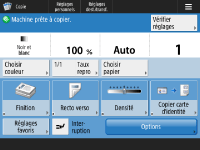 Appuyez sur la touche affichée sur l’écran <Accueil> et sur l’écran des fonctions de base pour personnaliser l’écran, par exemple en réorganisant les touches ou en créant une touche de raccourci. Personnalisation de l’afficheur tactile![]() Vous pouvez modifier les paramètres d'affichage, notamment en définissant l'écran qui doit apparaître lorsque l'appareil est mis sous tension ou en indiquant si le message de niveau de papier ou de toner doit apparaître. <Réglages d'affichage> Vous pouvez définir l'écran qui doit s'afficher au-delà d'un certain délai d'inactivité. <Fonction après réinit. auto> |