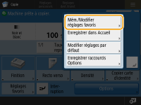 Appuyez sur <Réglages favoris> sur l'écran des fonctions de base du mode Copie.