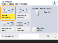 Lorsque l'écran de sélection du format de l'original s'afficheSi l'option <Choisir papier> est réglée sur <Auto>, il peut arriver que l'écran servant à sélectionner le format de l'original s'affiche. Cet écran s'affiche parce que le format de l'original ne peut être vérifié et le papier automatiquement sélectionné lors de l'installation de documents très transparents, des originaux avec des couleurs de base extrêmement sombres ou des documents de petit format. Sélectionnez le format de l'original ou un format proche de celui de l'original. Si l'option <Choix auto source papier> est définie sur <Non> pour une source de papier particulière, vous ne pouvez pas réaliser de copies sur le papier chargé dans cette source de papier lorsque <Choisir papier> est défini sur <Auto>. <Choix auto source papier> De plus, même si <Choix auto source papier> est défini sur <Oui> pour une source de papier, selon le type de papier, la sélection automatique du papier peut ne pas être effectuée. Pour utiliser le papier chargé dans une cassette pour laquelle la sélection automatique du papier ne peut pas être effectuée, spécifiez manuellement la cassette. |